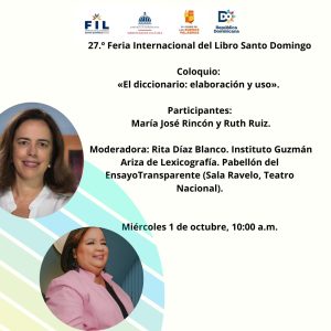 La actividad, de acceso libre, «El diccionario: elaboración y uso» se desarrollará en el Pabellón del Ensayo Transparente (Sala Ravelo del Teatro Nacional) en el marco de la XXVII Feria Internacional del Libro de Santo Domingo que se celebrará en Santo Domingo del 25 de septiembre al 5 de octubre de 2025 en la Plaza de la Cultura.